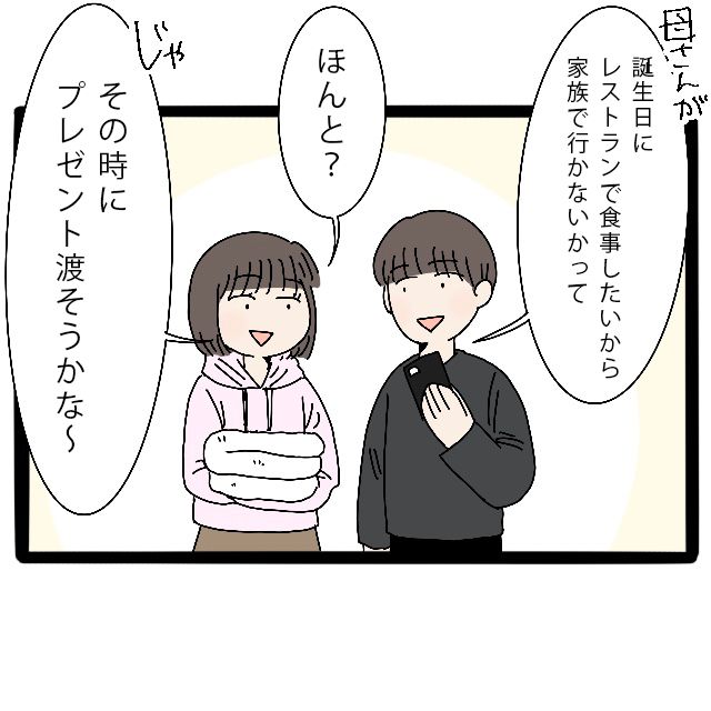「母さんが、誕生日にレストランで食事したいから、家族で行かないかって」