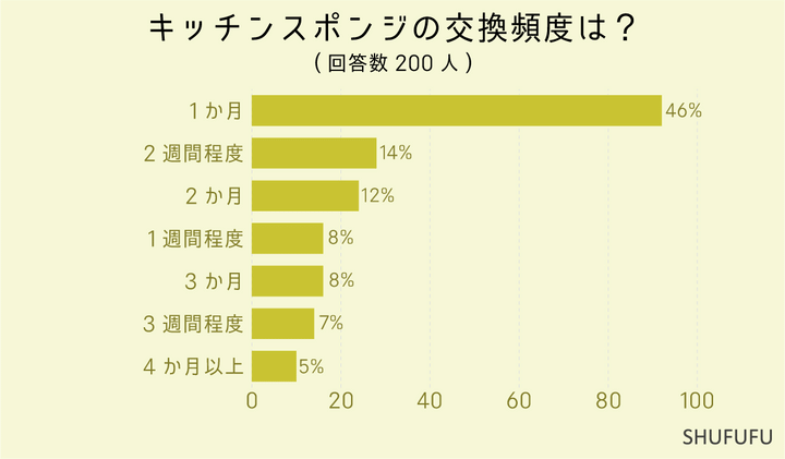 キッチンスポンジの交換頻度は?の問いに対して最も多かったのが「1ヶ月(46%)」でした。 次いで「2週間程度(14%)」「2ヶ月(12%)」という結果でした。