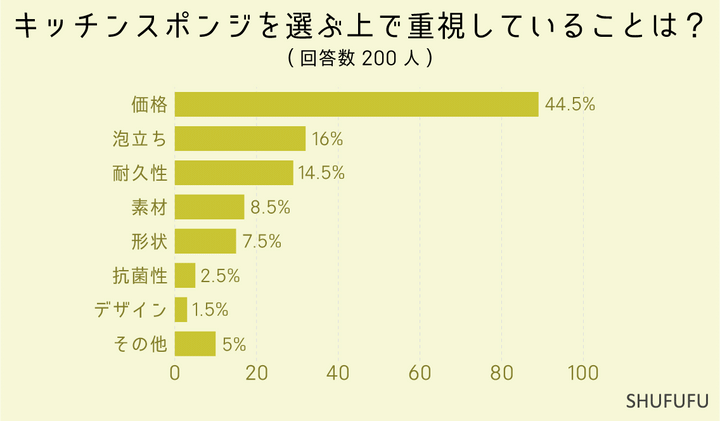 やはりキッチンスポンジは消耗品ですし、値段が一番重視するポイントとのことでした。 反対にデザインや抗菌性はあまり重視されていないようです。
