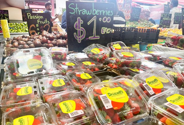 野菜や果物は、マーケット(市場)で買う方がお得。いちご1パック1ドル(約98円)、レタス2ドル(約195円)、玉ねぎ10キロ5ドル(約490円)、アボカド3個で1ドル(約98円)など、安くなっていることもあります。