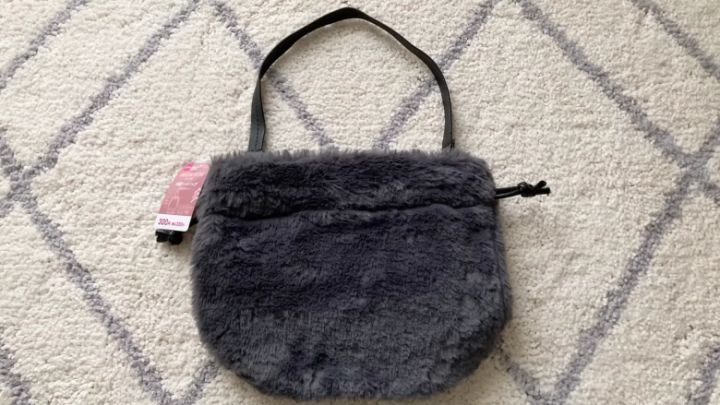 外側はふわふわのエコファーで、内側はナイロン素材を採用。合皮レザーの持ち手は取り外し可能で、ひもを絞れば巾着バッグやポーチとしても使えます。