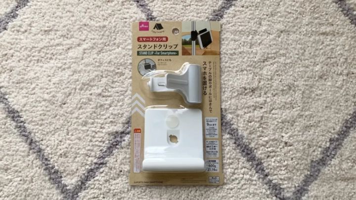 スマートフォン用のスタンドクリップ。ポール対応サイズは直径1.5cm~2cmで、厚み0.9cmまでのスマートフォンを立てかけられます。