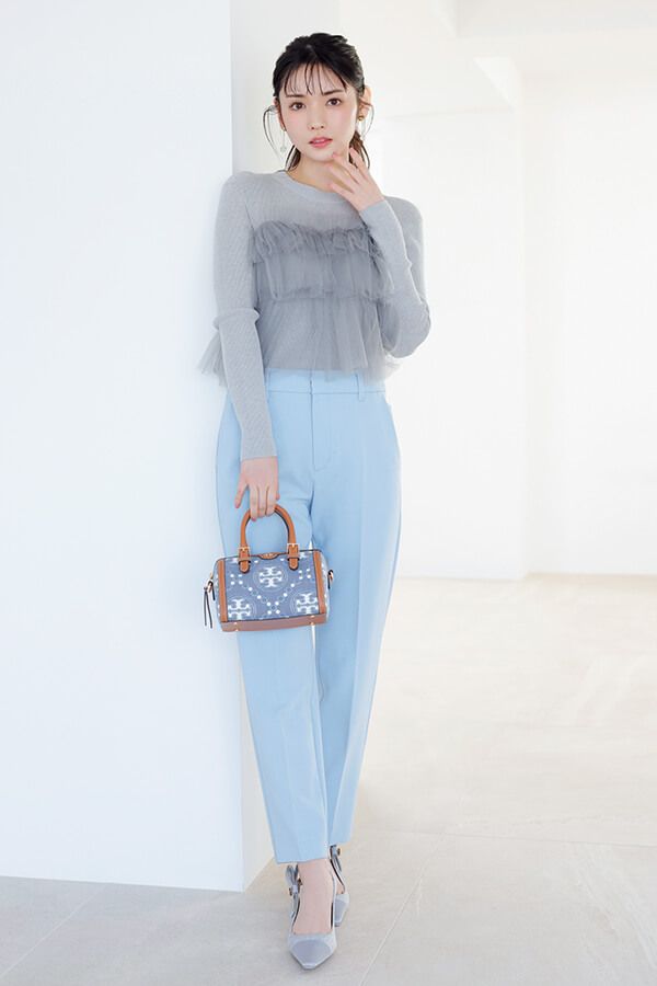 チュールフリルをビスチェのようにたっぷりあしらった異素材コンビニット。パステルブルーのタックパンツと寒色系でまとめて、春らしい透明感を演出するのがおすすめ。
