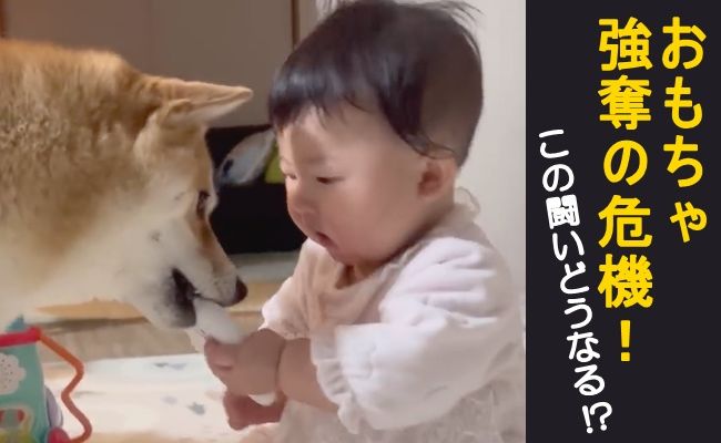 ひよりちゃんがちょっと手を離した隙に、わらびちゃんがおもちゃをくわえて…