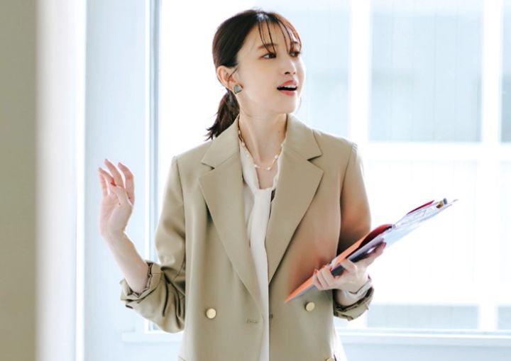 話しかけやすい印象を出したい日は、ベージュJKを主役に全体をアイボリー調で統一。髪も女性らしくを心がけて、清潔感のあるスタイルに。