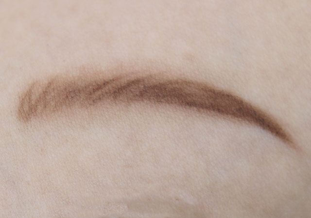 実際に目元に描くときは眉はこれとほぼ同じように発色しますが、目尻に描くときは発色控えめ。肌に馴染むせいか、かなりナチュラルな印象に。