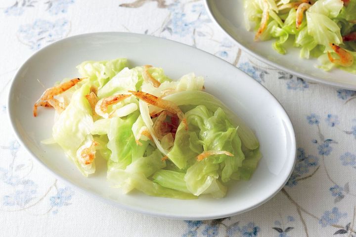 キャベツは葉は食べやすくちぎり、しんは薄切りにする。耐熱のボールに入れてふんわりとラップをかけ、電子レンジ(600W)で2分ほど加熱する。ざるに上げ、粗熱が取れたら水けを拭く。桜えびは大きめの耐熱のボールに入れ、ラップをかけずに電子レンジで10秒加熱する。