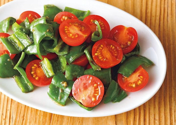 ピーマンは縦半分に切り、へたと種を取る。オーブントースターでしんなりするまで4~5分焼く。粗熱が取れたら縦半分に切って横に幅2cmに切る。ミニトマトはへたを取り、縦半分に切る。