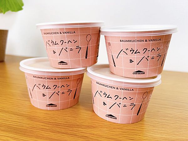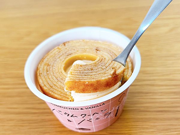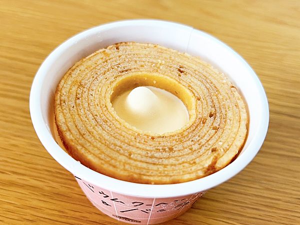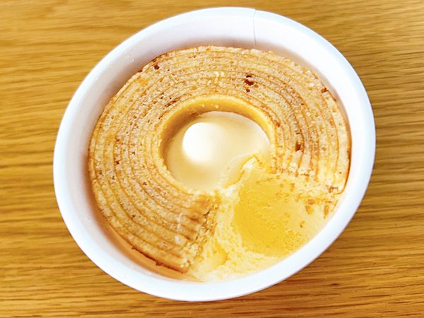 カップのふたを開けてみるとこんな感じ。バニラアイスの上に本当にバウムクーヘンがのっています。