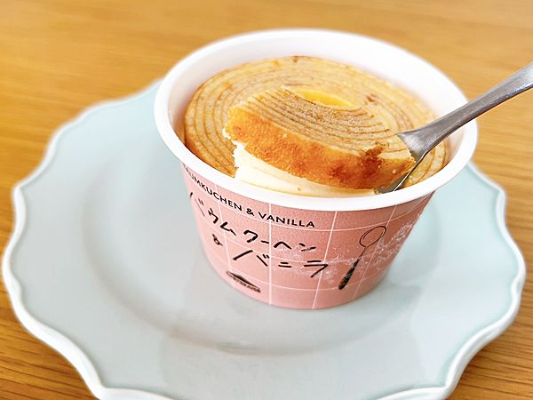 やはり一緒に食べるべき?と思いながらも一口。しっとりしたバウムクーヘンとシンプルなバニラアイスが相性ぴったり。一瞬で完食してしまいました。