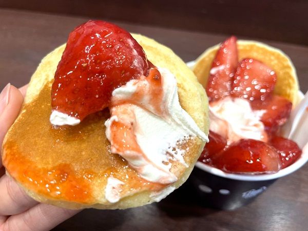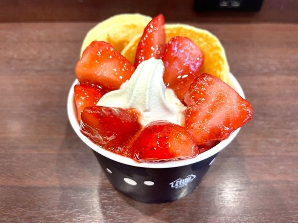 「いちごパンケーキソフト」(テイクアウト581円)は、パンケーキソフトにいちごを豪快にトッピングした商品。ノーマルよりひと回り大きなカップに入っていて、見た目も豪華です。