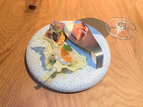 内覧会のこの日は、「フルーツトマトのマシュマロ」と「バルミジャーノのサブレと猪のパテ」、「あおさ海苔チップス 帆立とアンチョビクリーム」をいただきました。