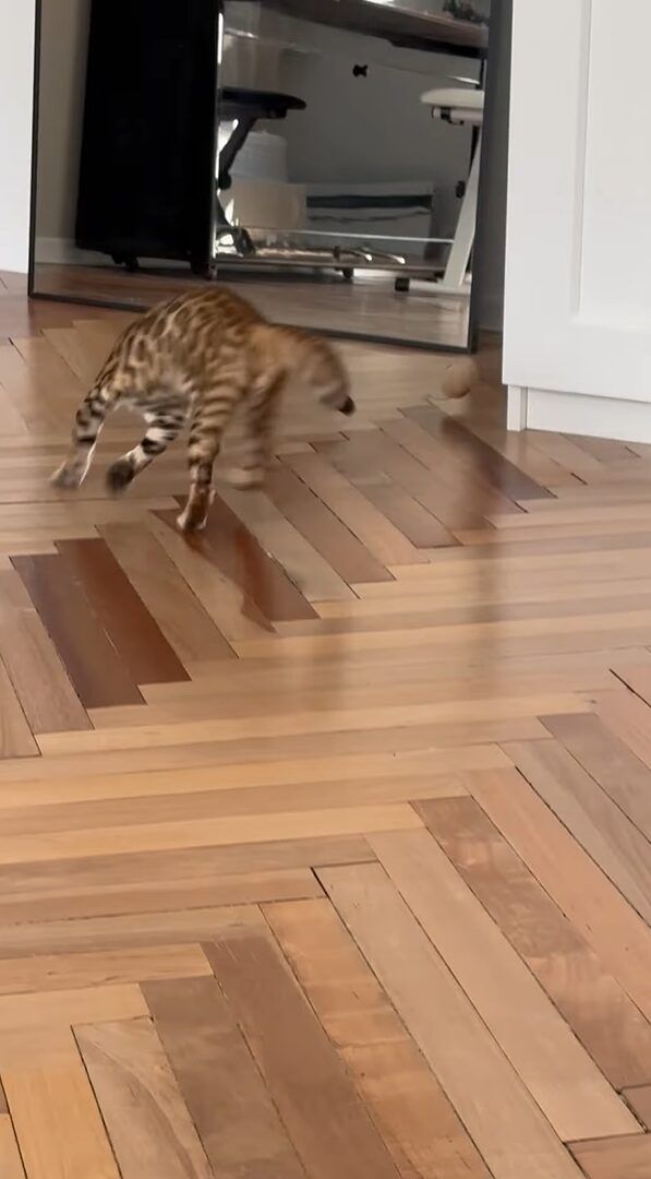 音の出るオモチャで全力で遊んでいた子猫。 転がっていったオモチャを追いかけていきましたが・・・