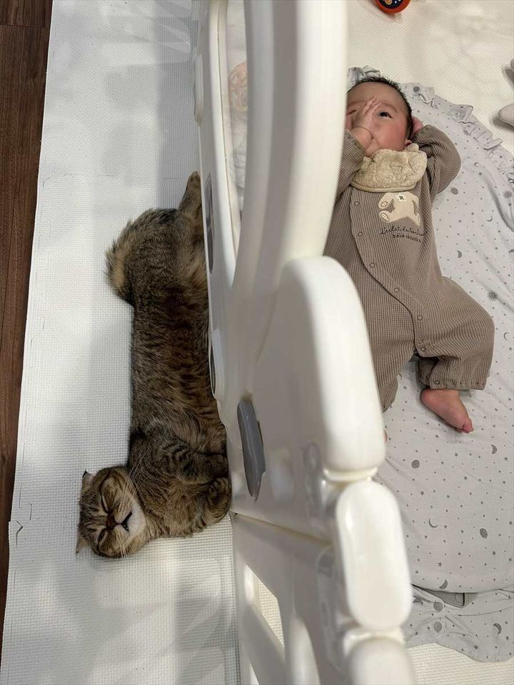 赤ちゃんを見守っていたところ、先に自分がおねむになってしまった猫。 そんな微笑ましい光景をご紹介します。