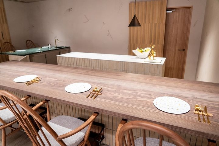 2階には隠れ家のようなサロンがあります。こちらは4月オープン予定となっていて、ヨーロッパの邸宅をイメージした「シェフズテーブル」として、デザートコース(アシェットデセール)やパフェなどを楽しめるそう。まるでシェフの家に招かれたようなプライベート空間は、オープンキッチンを前にした6席のみ。