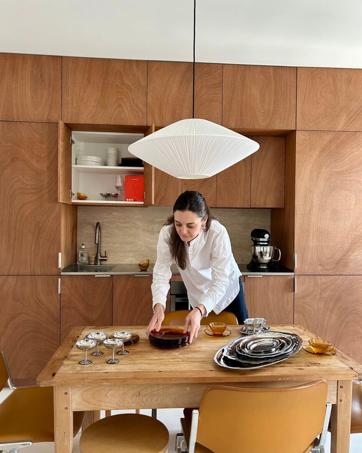 白を基調としたシンプルなアパートの中で、キッチンスペースは温もりのある空間を演出するために深みのあるブラウンのウッドをチョイス。ミッドセンチュリー、70年代、北欧スタイル、日本のミニマリズムからインスピレーションを受けたそう。普段から友達や家族を招いて頻繁にホームパーティーを開催するので、そんな時はオープンキッチンがぴったり。ゲストとの会話を楽しみながら、心置きなく料理もできるところがお気に入り。