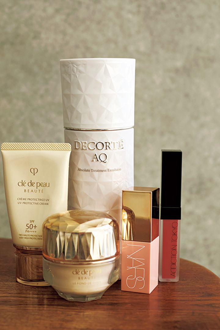 笑顔には美肌が必須。肌作りに時間をかけます。コスメデコルテのAQアブソリュートエマルジョンマイクロラディアンスIIでふっくら肌、チークはNARSのアフターグローリキッドブラッシュで。
