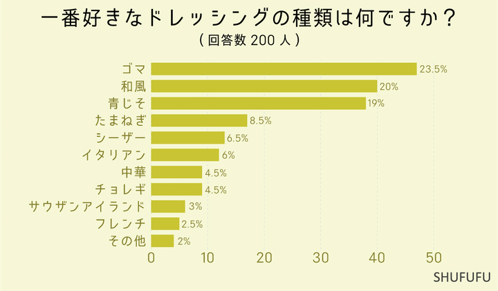 一番好きなドレッシングの種類についての質問に対して、最も多い回答は「ゴマ(23.5%)」となりました。 次いで「和風(20%)」「青じそ(19%)」という結果でした。 4位のたまねぎは「8.5%」なので、1位~3位の間で拮抗しているようです。