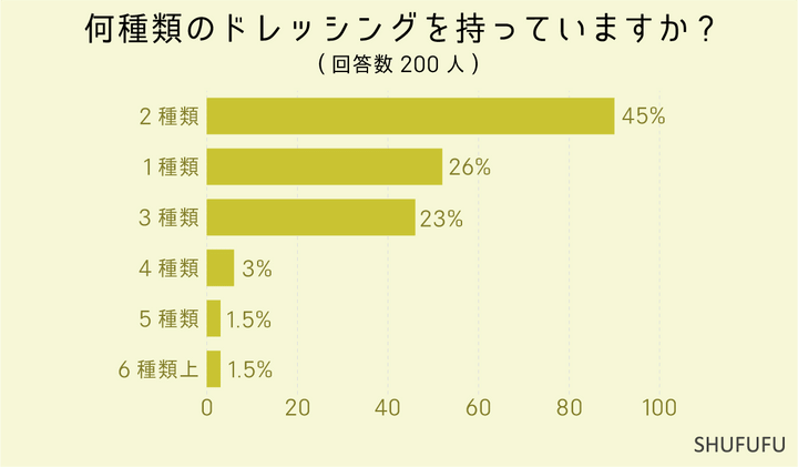 持っているドレッシングの種類についての質問に対して最も多かった回答は「2種類(45%)」でした。 次いで「1種類(26%)」「3種類(23%)」という結果でした。