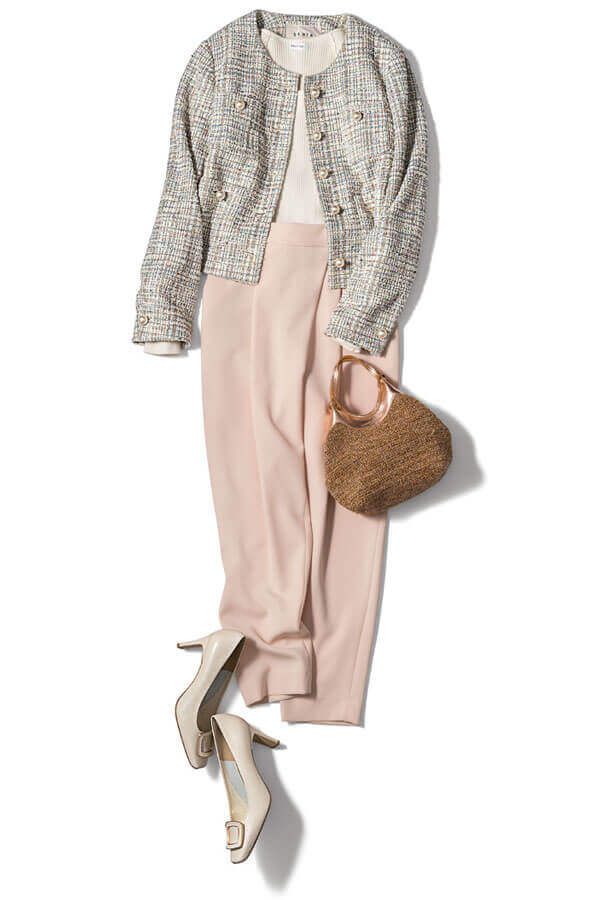 複数の色を組み合わせたミックスカラーツイードならどんな色ともなじみやすい! 好印象な淡色コーデの引き締め役にぴったりです♪