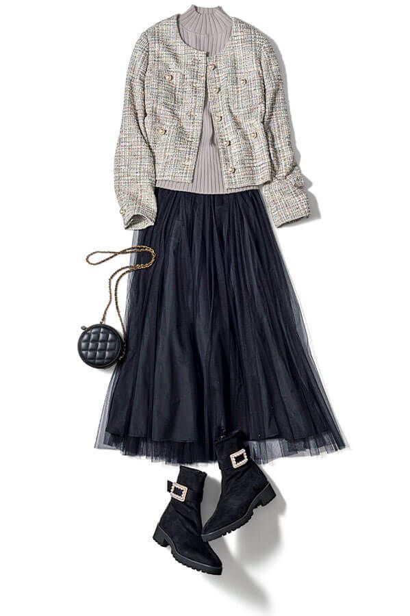 ジャケット¥24,200/ストラ ニット¥9,900/ソージュ(ソージュ オンラインストア) スカート¥30,900/マイカ アンド ディール(MICA & DEAL 恵比寿店) バッグ¥2,690/神戸レタス ブーツ¥28,050/ダイアナ(ダイアナ 銀座本店)