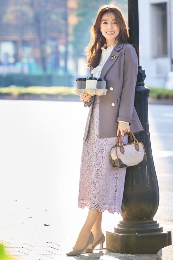 レーススカート×フリルブラウスの華感MAXなフェミニンコーデに、仕立ての良さが光るジャケットで大人な落ち着きをプラス。チャコールグレーのシックなカラーがくすみピンクのスカートとマッチして、上品な甘さを演出してくれます。