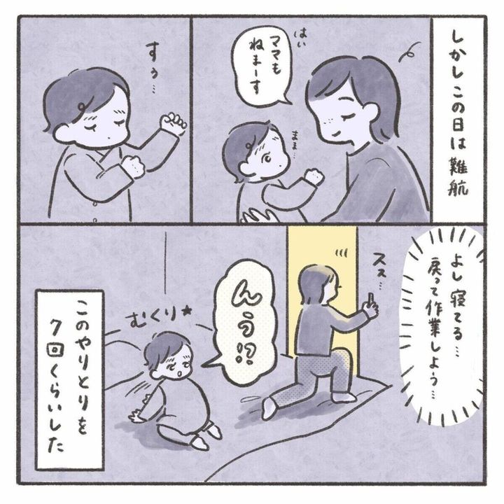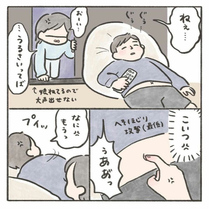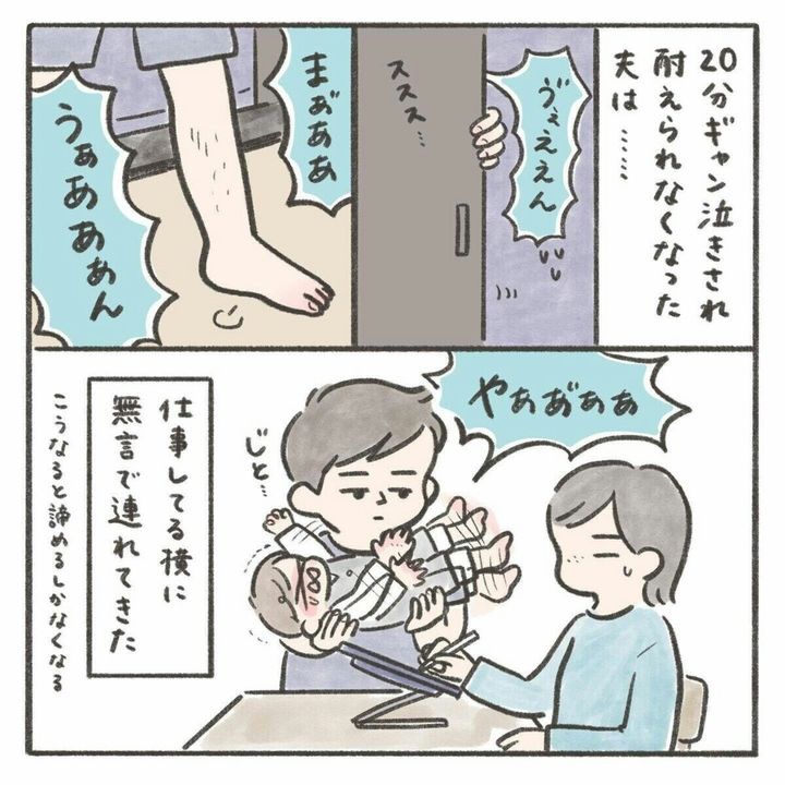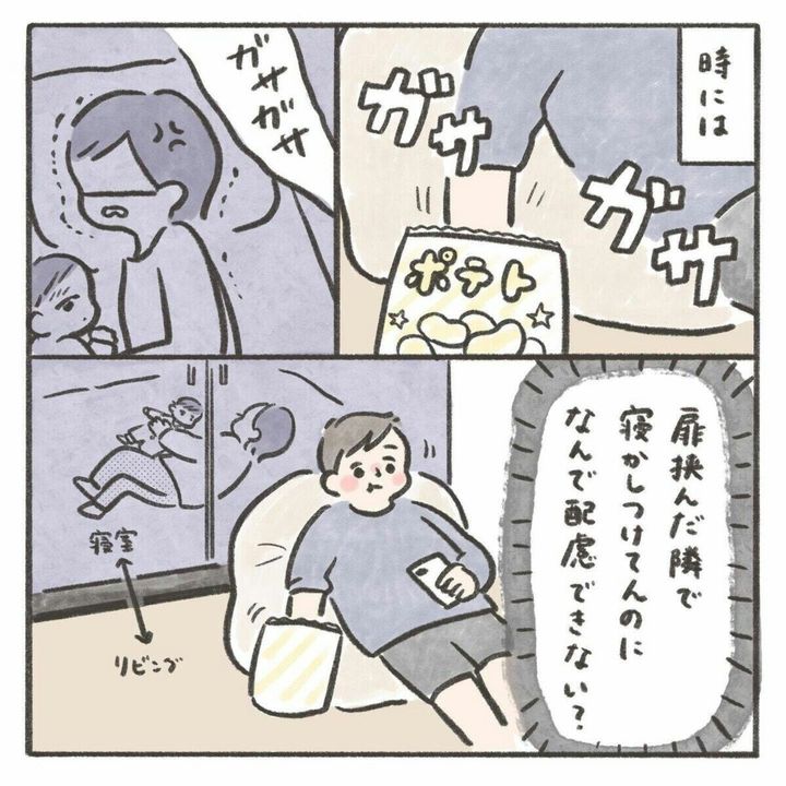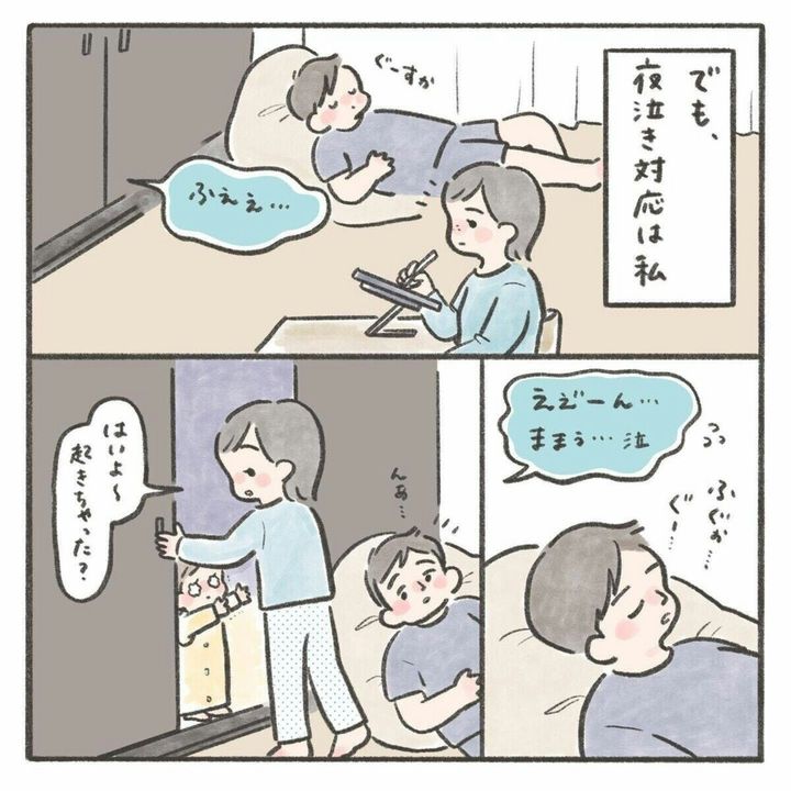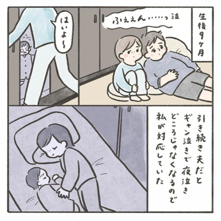 娘が生まれてすぐは夜泣きをすれば起きて一緒に対応をしてくれていた夫。しかし、娘が生後9か月になるころには夜泣きの対応をしないどころか同じ部屋にいることもなく、隣の部屋でいびきをかいて寝ていたり、大きな音を立ててお菓子を食べたり、全く配慮のない行動をするようになっていきます。どうしてもママじゃなければいけないという時期で仕方ないという気持ちはありつつも、夫が全く寄り添ってくれないことは悲しいことですよね。