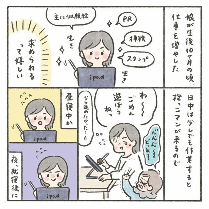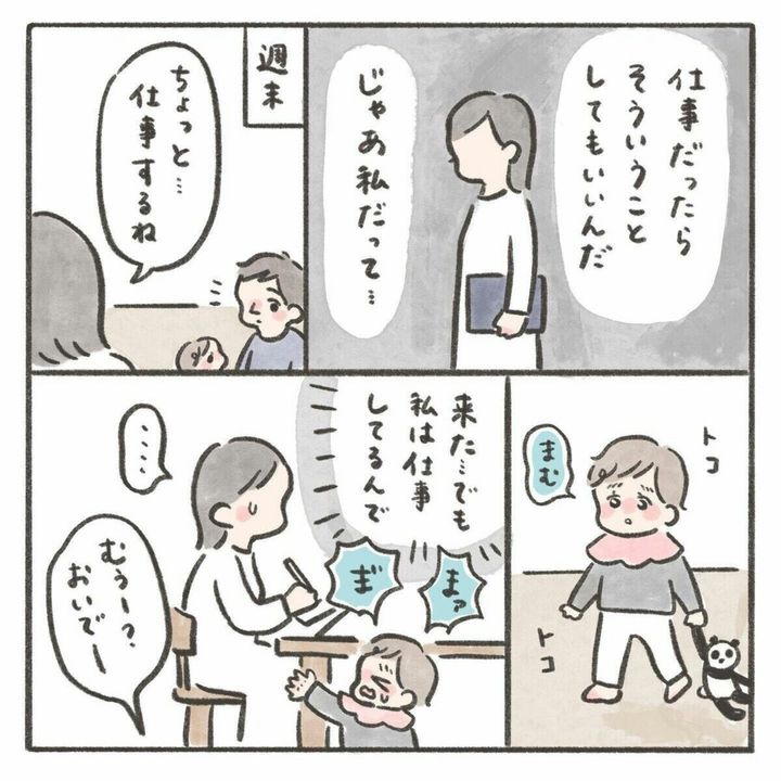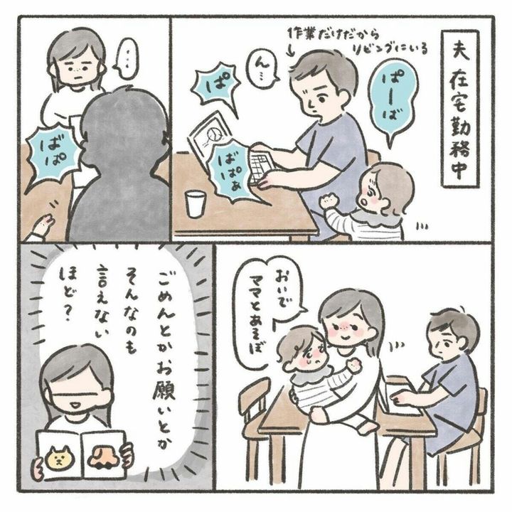在宅勤務中の夫の元に娘が行っても娘を無視し続ける夫。miiさんは娘に声をかけると一緒に遊ぶことにします。しかし、心の中では「ごめんとかお願いも言えないほど?」と夫にイライラしている様子です。たった一言でも何かあれば言われた方の気持ちは楽になるものですよね。仕事中で遊べないというのはわかりますが、それならばmiiさんが仕事をしている間は責任を持ってお世話をしてほしいものです。夫は仕事を優先できるのに、自分はそれをさせてもらえないというのもmiiさんにとってはストレスだったでしょうね。