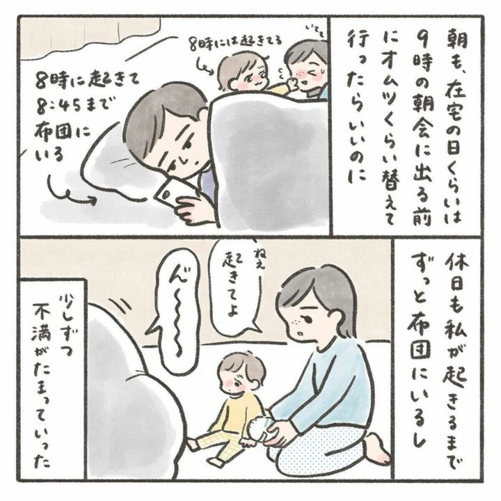 夫のちょっとした行動すらも不満に感じるようになっていたmiiさん。仕事をしているのは自分も夫も同じなのに、育児をするのは自分ばかりで夜泣きの対応も自分。夫は寝かしつける努力もせず、困ったらすぐに頼ってくることにモヤモヤとしていました。