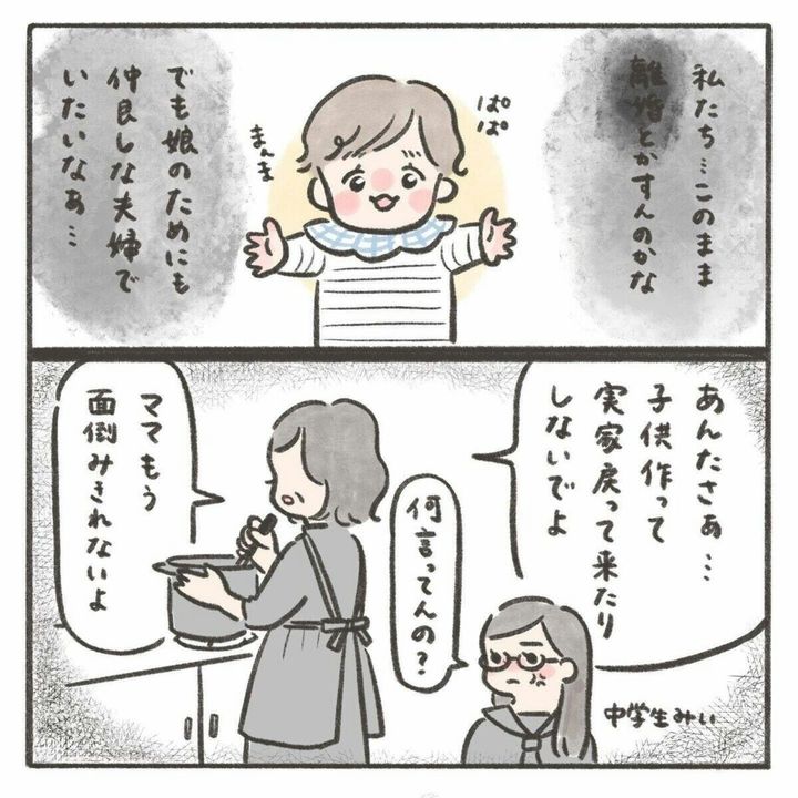 育児のことを発端に夫婦の関係まで変化していった2人。同じ部屋にいても会話はなく、目も合わせていませんね。miiさんはこのまま離婚になるのかな…と思わず不安な気持ちになりますが、一方で娘のためにも仲の良い夫婦でいたいという気持ちを持っているようです。夫はこの状況についてどう考えているのでしょうね。