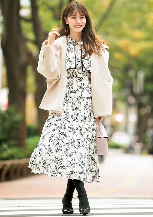 「レディメイドのキレイめワンピは、シーンを選ばない必需品!淡色でまとめたコーデはデートだけでなく、女子会でも活躍すること間違いなし。花柄ワンピのフェミニンさを胸元のカロットオフデザインが抑え、大人っぽさを加えてくれます」(モデル・山崎春佳さん/28歳)