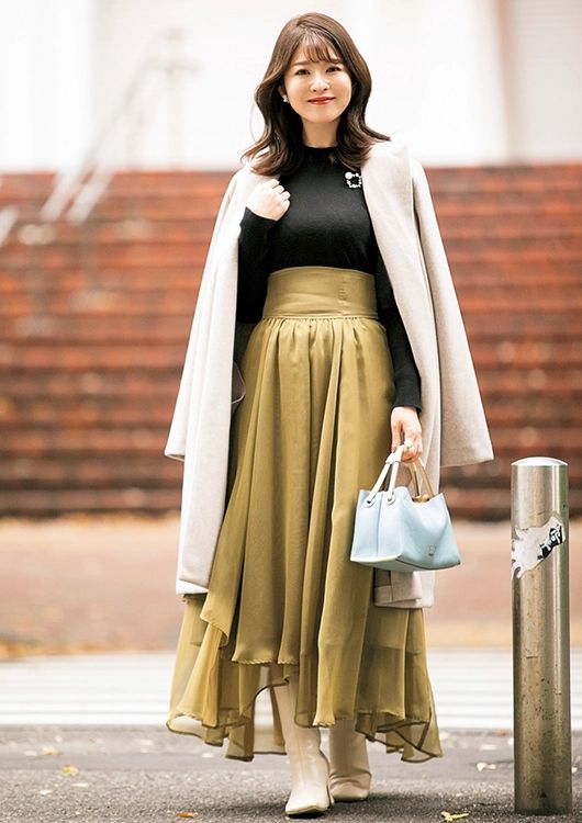 「ダークトーンコーデには、歩くたびにふんわりと揺れるイレヘムスカートで、華やかさをプラスしてみました♡また、落ち着いたカーキにすることで、派手すぎずカジュアルすぎないバランスになるので、女子旅でも浮かずにぴったりだと思います!」(アパレルプレス・高橋美有さん/34歳)