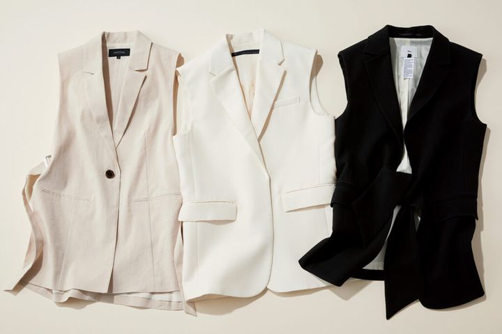 [右から]同素材のジャケット&パンツもあり、スリーピースでも着られる。ジレ[3月発売予定]¥18,920(ネイヴ)気持ち上についたボタンで、スタイルUP効果も。ジレ¥17,600(スピック&スパン/スピック&スパン ルミネ有楽町店)ネイビー×金ボタンもノーカラーで新鮮な印象に。ほどよい長さの丈感でシャープに着られる。ジレ¥18,590(WHITE/スーツスクエア TOKYO GINZA店)