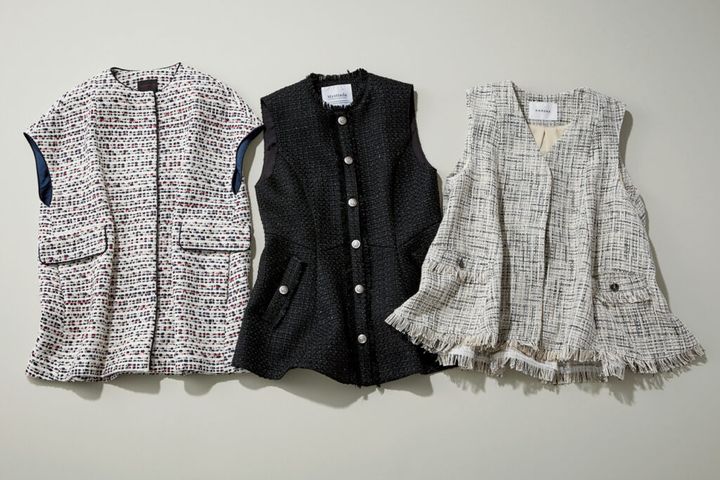 [右から]フレアシルエットと裾のフリンジでより華やかに。ジレ¥27,500(カデュネ/カデュネ プレスルーム)パールボタンにAラインシルエットで着映え度No.1!ジレ¥25,300(マイストラーダ/マイストラーダ プレスルーム)さりげなく赤が効いたトリコロールカラーのツイード。ジレ¥83,600(TOMORROWLAND collection/TOMORROWLAND)