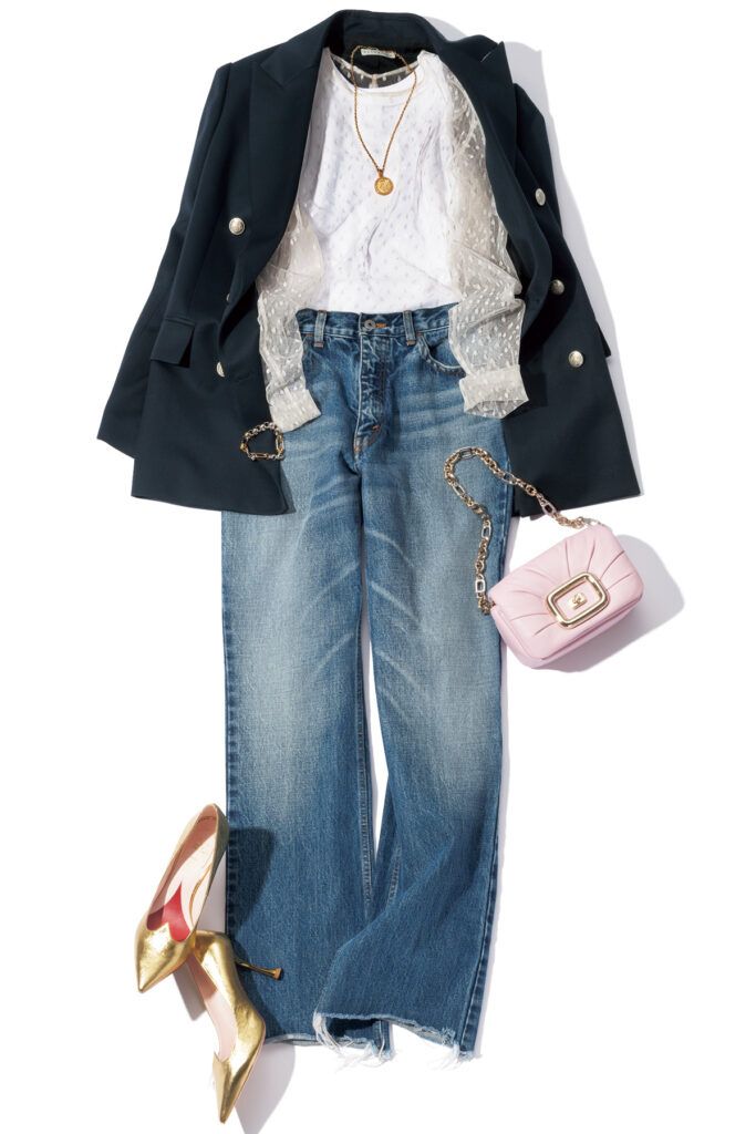 紺ブレはシルバーボタンでトラッドすぎないものをセレクト。ヴィンテージ感を出したくて、フレアデニムに女らしいピンヒールを。ドットのチュールトップスのシースルー感×ホワイトのタンクトップのレイヤードで、セクシーすぎない隙を添えて。