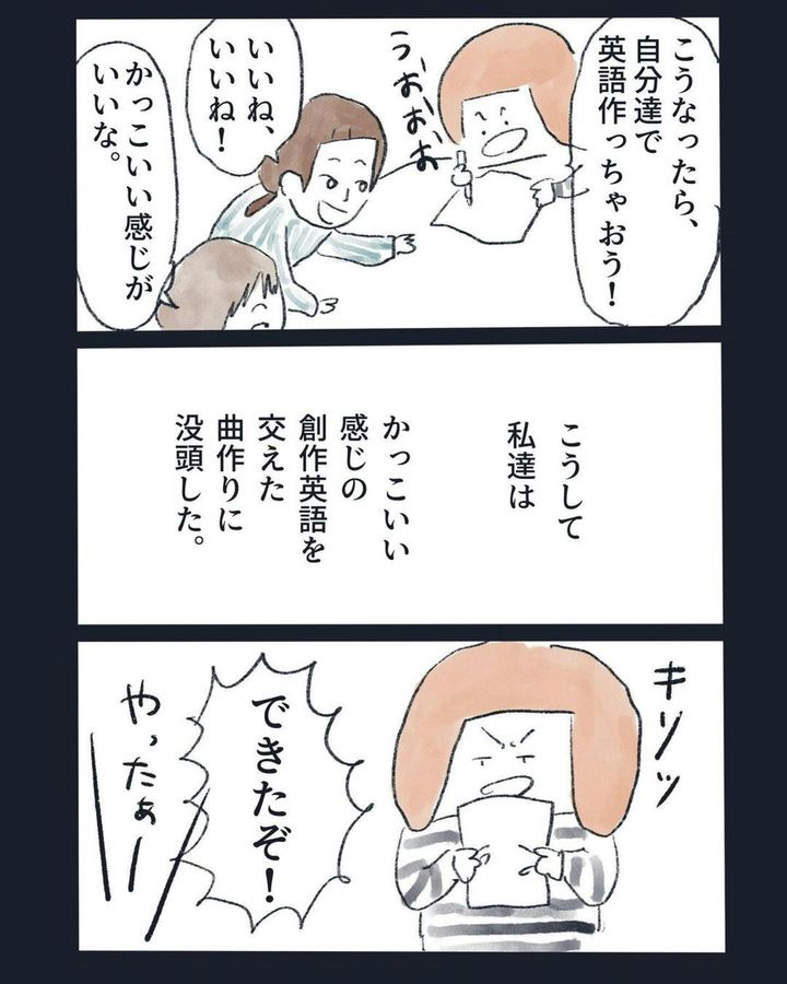 英語が全然しゃべれなくても、それっぽく聞こえるだけでかっこいいですよね。創作英語も歌にすればさまになって、かか丸。さんたちは大満足。