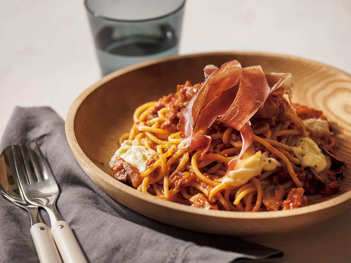 チーズが溶けるよう、ミートソースとパスタは熱々にするのがおすすめ。食べ進むうちにほんのり余熱が入る生ハムがアクセントに。
