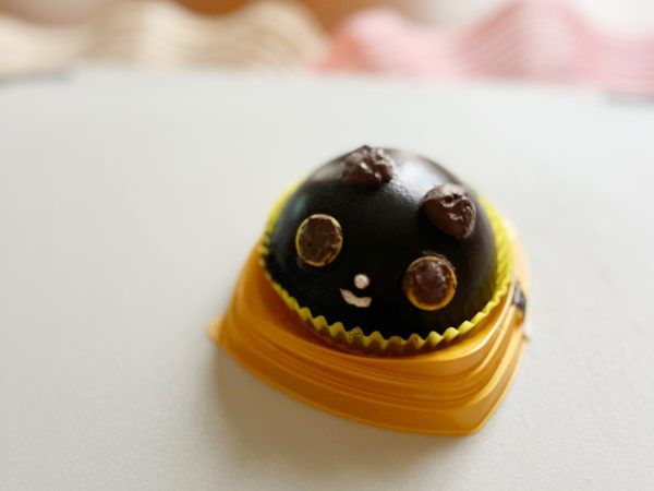 そう!ネコと言えば、クロネコヤマト。笑。その黒ネコをイメージしたカップケーキです。スポンジの上にチョコビスケットとチョコクリームを乗せ、チョココーティングしました。