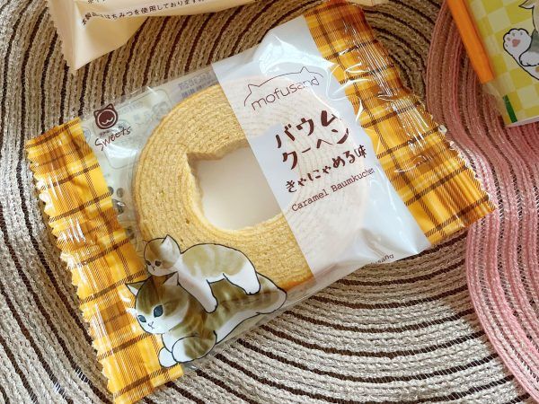 バウムクーヘンの真ん中がなんとネコ型に。開けた瞬間からキャラメルの香りが食欲をそそるしっとりとしたバウムクーヘンでした。