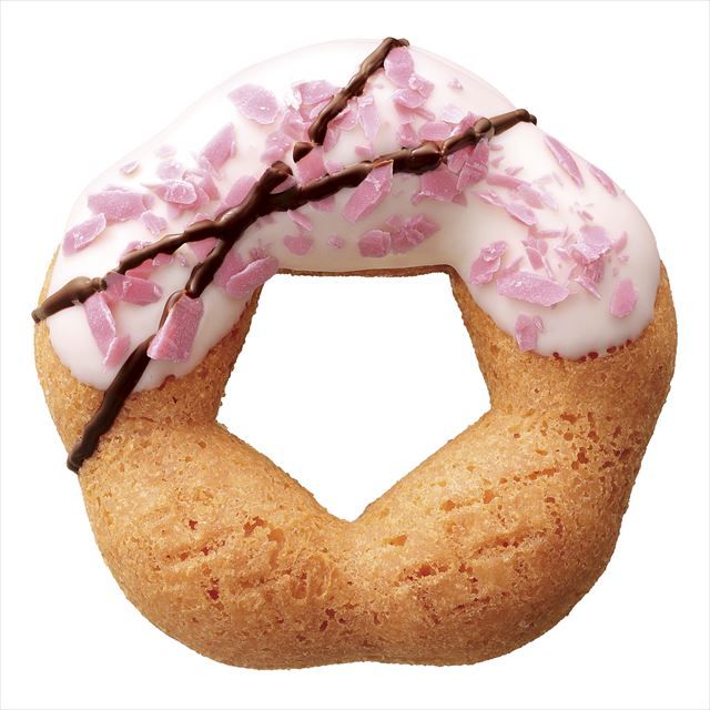 桜もち風味のもちっと生地に、北海道産あずきのあんをサンドし、ホワイトチョコと桜風味のフレークチョコ、チョコレートの線掛けで仕上げたドーナツです。