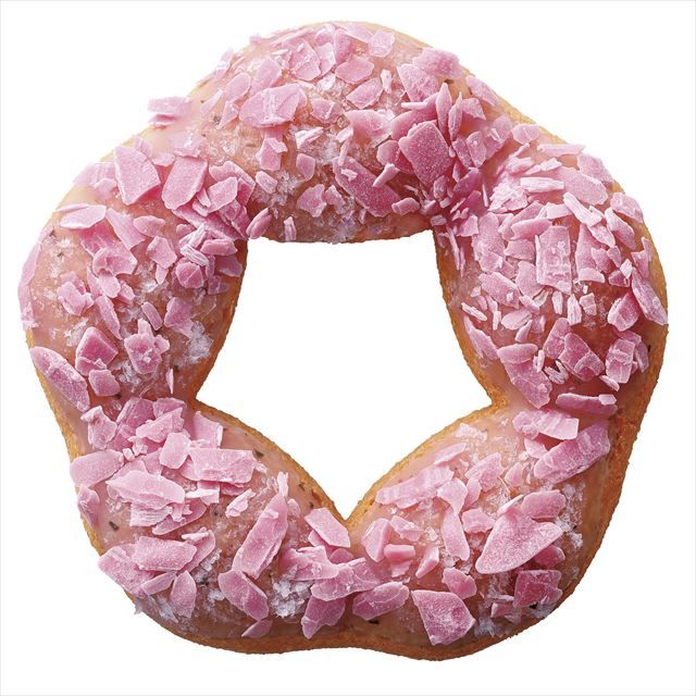 桜もち風味のもちっと生地に、桜葉入りの桜あんをコーティングし、桜風味のフレークチョコとキラキラトッピングで仕上げられたドーナツです。