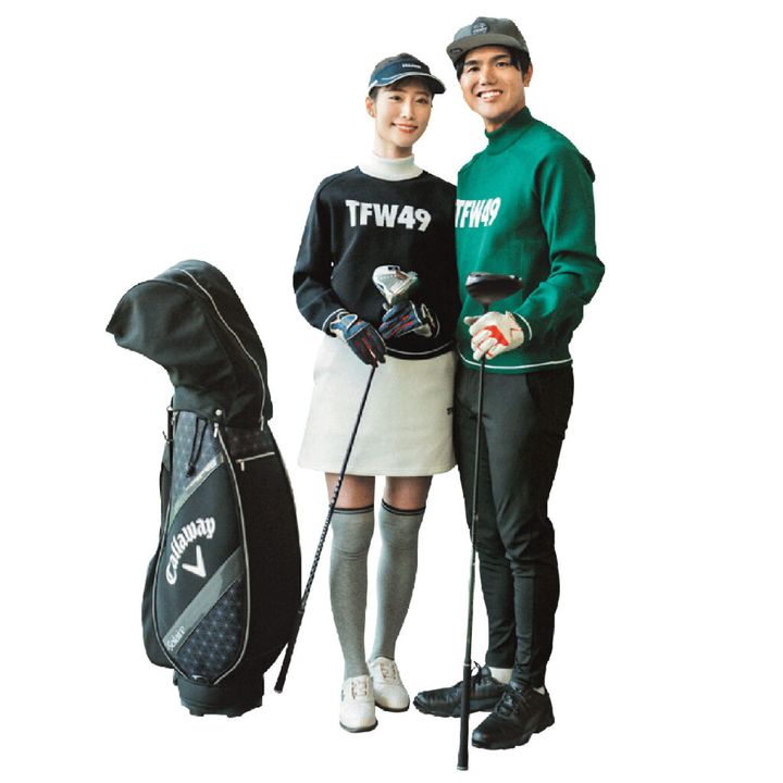 ペアルックコーデを楽しめるのもゴルフならではの魅力。まだまだ数は少ないですが、ゴルフショップで可愛いウェアを見つけたらお揃いで買うようにしています。最近購入したのは「TFW49」のロゴスウェット。私はモノトーンで彼は色違いでワントーンと、完全一致じゃないペアルック仕様がオシャレで気に入っています。