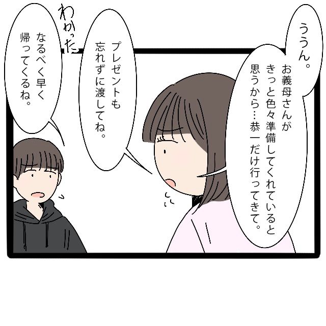 「ううん。お義母さんがいろいろ準備してくれていると思うから・・恭一だけ行ってきて。プレゼントも忘れずに渡してね」