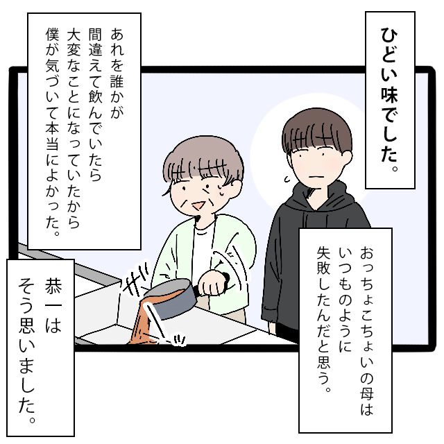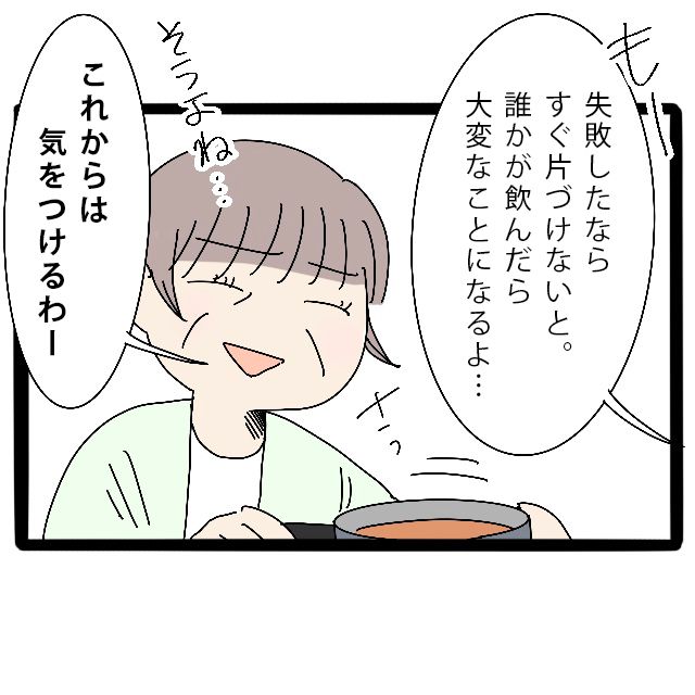 「もー!失敗したならすぐ片付けないと。誰かが飲んだら大変なことになるよ・・」