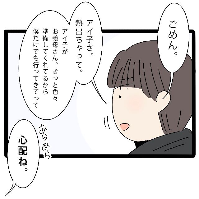 「ごめん。アイ子さ、熱出ちゃって。アイ子が、お義母さん、きっといろいろ準備してくれてるから僕だけでも行って来てって」