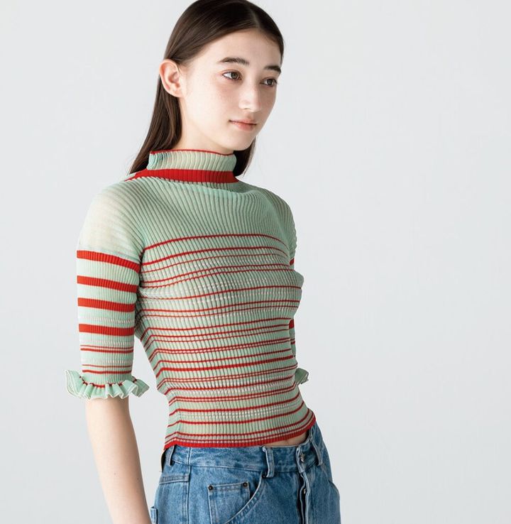 爽やかなミントグリーンに赤ボーダーが映える。トップス¥50,600(ナディア ワイヤー×レイ ビームス/レイ ビームス 新宿 TEL:03・5368・2191) デニム¥49,500(オペラスポーツ/アダム エ ロペ TEL:0120・298・133)