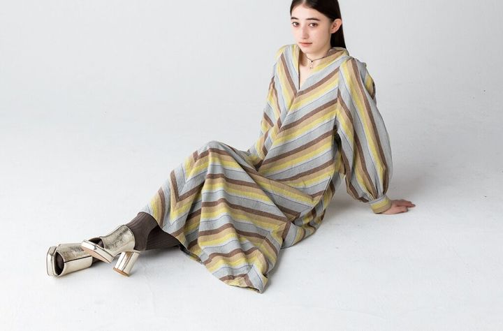 ダイアゴナルストライプの大胆なドレスは、淡いイエローやブラウン、アイスグレーなど落ち着いた色を組み合わせたプリントで、シックな印象に。1枚でさらりと着たい。¥38,500(サラマリカ/パサンド バイヌキテパ TEL:03・6427・9945) チョーカー¥47,300(ガブリエラ アルティガス/フレームワーク ルミネ新宿店 TEL:03・5324・7676) サンダル¥22,000(オデット エ オディール/オデット エ オディール 新宿店 TEL:03・5324・5080) ソックスはスタイリスト私物