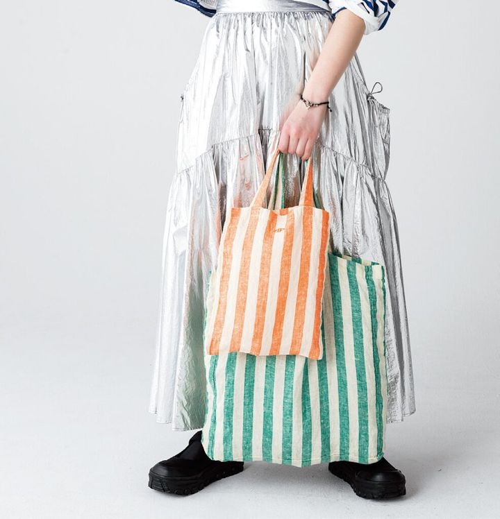 軽くてラフに使えるショッパーバッグはサイズ違いでそろえたい。W37×H41cm¥6,600 W25×H30cm¥3,300(共にロンハーマン TEL:0120・008・752) ブレスレット¥10,890(ヒプノタイズ×レイ ビームス/レイ ビームス 新宿)