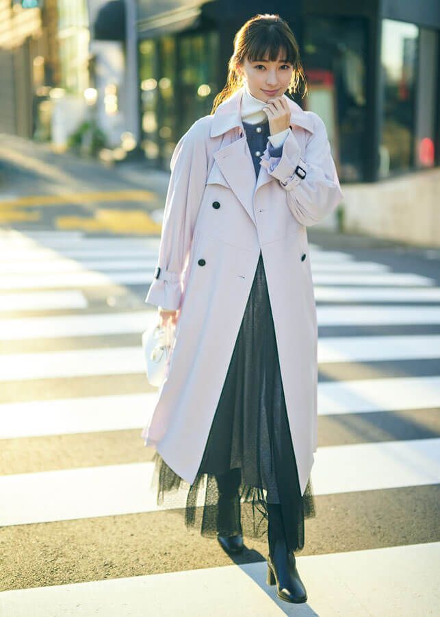 冬は…重たく見えがちなレイヤード服も春色トレンチで印象軽やか♪