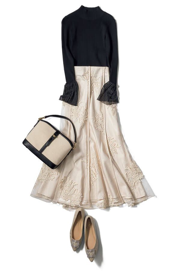 シアー素材に施したゴージャスな刺しゅうが立体感をプラスして白の面積が多くてものっぺり見えを回避! さらにモノクロコーデにリッチな華やぎを添えてくれます♡ 小物はベージュトーンでまとめて軽やかに。